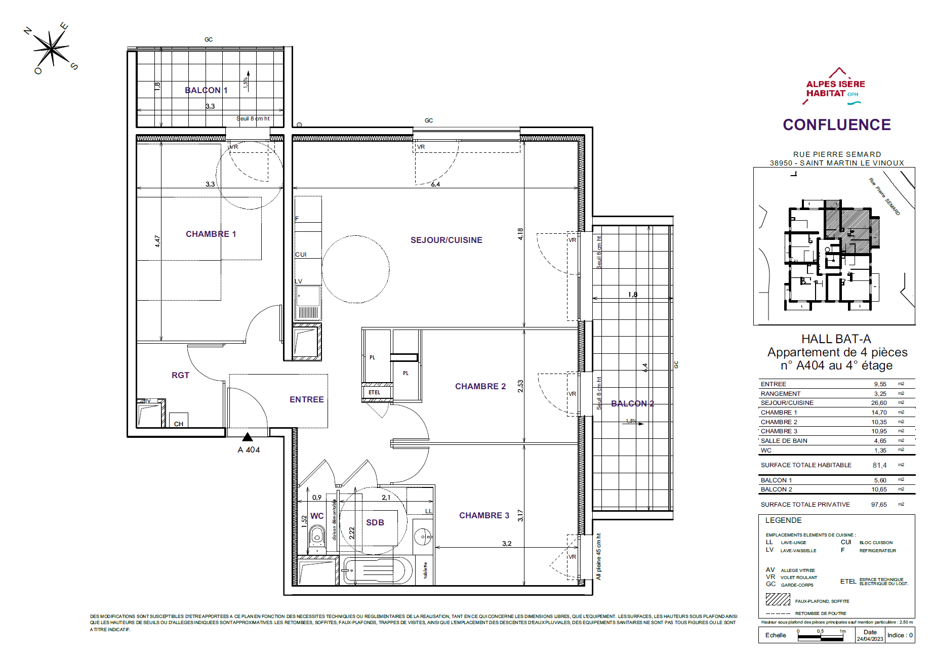 Lot A404 81,40 m² 4 Balcon 1 5,60 m² – Balcon 2 10,65 m² 200 000 € Télécharger le plan